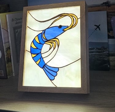 ”Merci d'avoir donné vie à mon idée farfelue de vitrail crevette bleu et jaune ! Le résultat est super avec le cadre rétroéclairé ! ” - Gaya