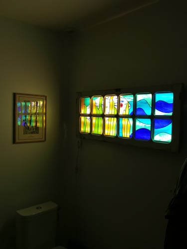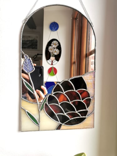 "Je recommande vivement le travail de Mylène. D’une idée abstraite, à la réalisation finale, le processus est fluide, Mylène nous accompagne en donnant vie au fur et à mesure à cette idée : en passant par des propositions de croquis, au choix des verres (couleurs, textures), la couleur de la soudure… Je suis ravie de mon vitrail, qui, je trouve, est fidèle à l’idée que je m’en faisait (et même plus joli ahah). Qui plus est, j’ai adoré la progression artistique du projet et voir ce vitrail prendre vie au fil de étapes. Enfin, la réalisation a été rapide et les échanges très fluides. Encore merci" - Lucie